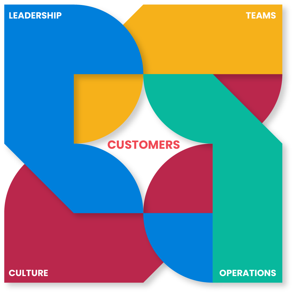 Our comprehensive Business Agility Framework consists of five pillars - Leadership, Teams, Operations, Culture, and Customers - that deliver customer-centric and organization-wide impact and value.